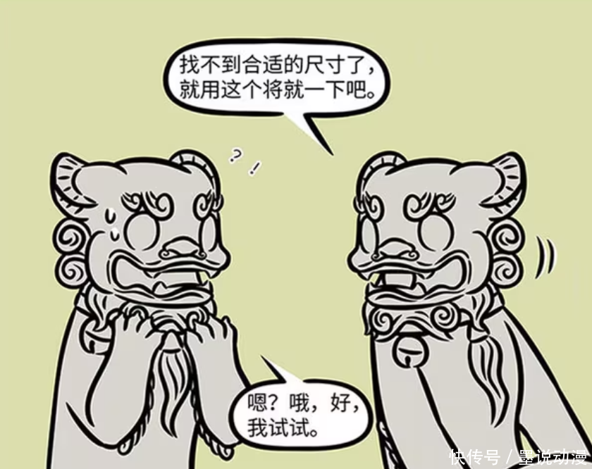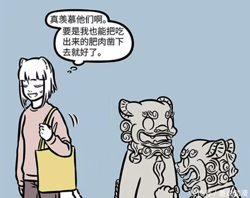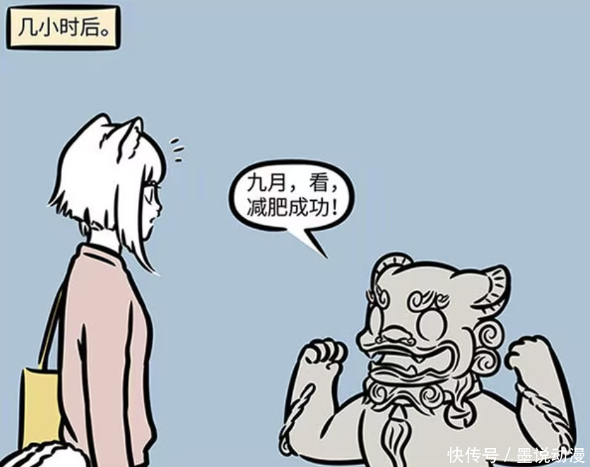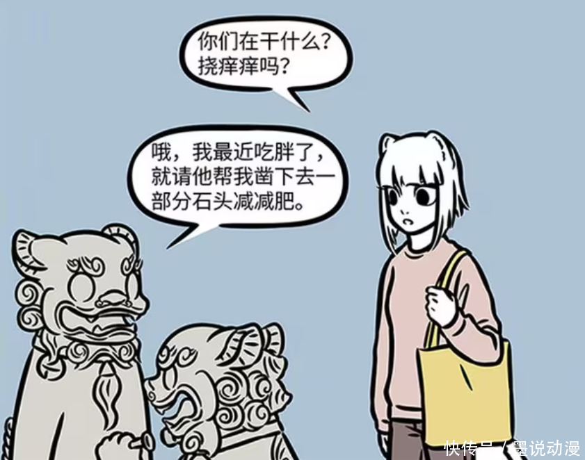 《非人哉》漫画版中,石狮子是每年都会出现的配角,每次关于他们的漫画内容出现,都让人觉得意想不到。这一次是石狮子小刘的同事,不小心吃掉了石球。小刘帮忙找了个石墩代替。石狮子小刘吃胖之后,让同事帮他减肥,九月也因此见证小刘凿出腹肌。