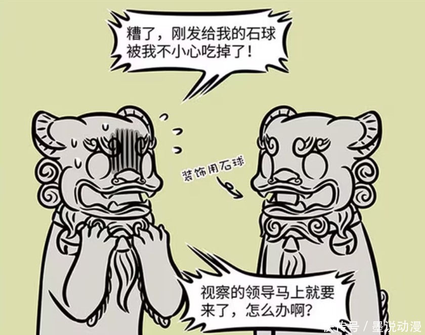 原本以为石狮子小刘已经够不靠谱了,没想到他的同事更不靠谱。这只石狮子将刚发放的石球吃掉,如果是平时还可以补救,再去买一个就可以。可是现在情况特殊,领导要来视察,这只石狮子根本没有时间去买新的石球。